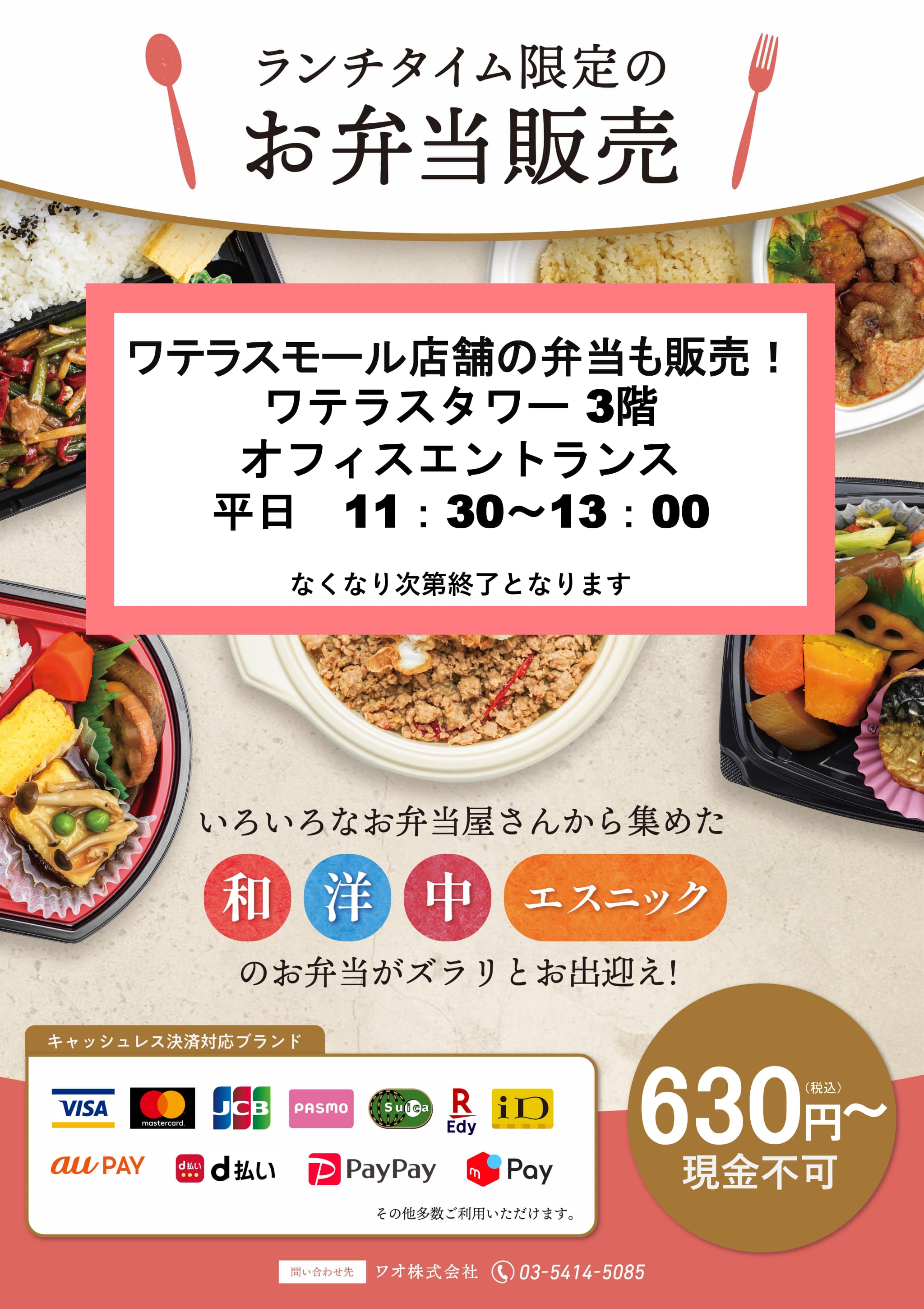 【11/4(火)より】ランチタイム限定のお弁当販売 2025.10.28 11/4(火)よりランチタイム限定で、 ワテラスタワー3Fオフィスエントランスにて お弁当販売を実施いたします。 ワテラスモールのお弁当をはじめ 和洋中エスニックのお弁当がずらりとお出迎え! 場所:ワテラスタワー3F オフィスエントランス 平日:11:30~13:00 ※なくなり次第終了となります ※現金払い不可(各種キャッシュレス決済をご利用ください) ニュースのトップへ